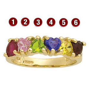 Honor a mother's love. This ring features 4x4mm heart shaped gemstones and two diamond accents. Choose one to six gemstones. Each is prong-set. Ring is available in white or yellow, 10k or 14k gold, with simulated or genuine birthstones.