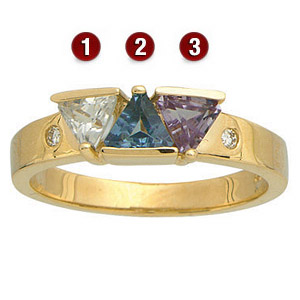 This best-selling design features 4x4x4mm trillion cut gemstones and two diamond accents. Choose one to six gemstones. Each is prong-set. Ring is available in white or yellow, 10k or 14k gold, with simulated or genuine birthstones.