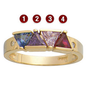 This best-selling design features 4x4x4mm trillion cut gemstones and two diamond accents. Choose one to six gemstones. Each is prong-set. Ring is available in white or yellow, 10k or 14k gold, with simulated or genuine birthstones.