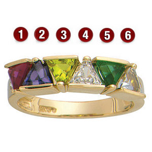 This best-selling design features 4x4x4mm trillion cut gemstones and two diamond accents. Choose one to six gemstones. Each is prong-set. Ring is available in white or yellow, 10k or 14k gold, with simulated or genuine birthstones.