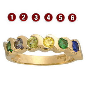 This ring is a perfect way to create a special memory. It features 3mm round facted gemstones and two diamond accents. Choose one to six gemstones, half bezel-set. This style is available in white or yellow, 10k or 14k gold, with simulated or genuine birthstones.