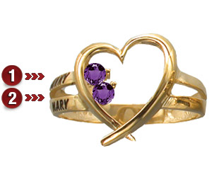 The Family Heart ring features personalization for 2 to 6 names and corresponding birthstones. Stones are 2.25 mm round. Engrave up to 7 characters per name. It is available with either simulated or genuine birthstones. Choose between 10K or 14K yellow or white gold.