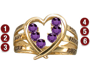 The Family Heart ring features personalization for 2 to 6 names and corresponding birthstones. Stones are 2.25 mm round. Engrave up to 7 characters per name. It is available with either simulated or genuine birthstones. Choose between 10K or 14K yellow or white gold.