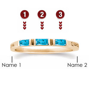 The 10kt yellow gold Triplet ring features three genuine baguette stones [4x2mm]. Engraving areas 1 and 2 fit up to 12 characters. Ring measures approx. 2.35mm at top width, 1.65mm at palm width. Import.