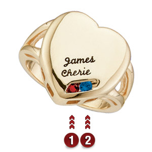 The Mother's Devotion ring features personalization for 1 to 4 names and corresponding birthstones. Stones are 2.0 mm round cut. Engrave up to 8 characters per name. It is available with simulated or genuine birthstones. Channel set stones. Ring's gold content weighs approximately 8.45 grams. Choose between 10K or 14K yellow or white gold.
