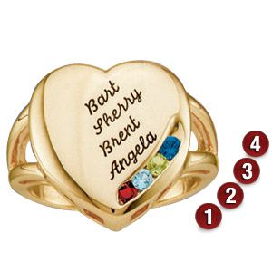 The Mother's Devotion ring features personalization for 1 to 4 names and corresponding birthstones. Stones are 2.0 mm round cut. Engrave up to 8 characters per name. It is available with simulated or genuine birthstones. Channel set stones. Ring's gold content weighs approximately 8.45 grams. Choose between 10K or 14K yellow or white gold.