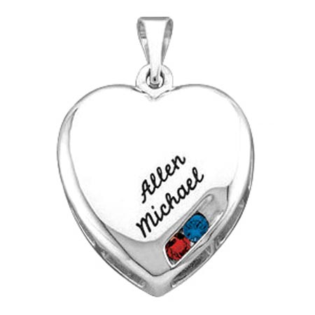 14k white gold close to my heart pendant features personalization for two names and corresponding genuine birthstones. Width is 17mm, height 17.25mm. Stones are 2.0 mm round cut, channel set. Engrave up to 8 characters per name. Name 1 engraving is located at the bottom of the pendant, closest to the stones. Stone 1 is at the bottom left. Engraving positions ascend. Chain not included.