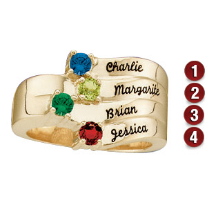 Decorate this ring with birthstones mom was born to love. This ring represents the bond between mother and her children. Choose one to four names and corresponding birthstones. Prong set gemstones measure 3.0mm in diameter. Engrave up to 8 characters per name. Choose from 10K or 14K yellow or white gold.