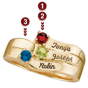 Decorate this ring with birthstones mom was born to love. This ring represents the bond between mother and her children. Choose one to four names and corresponding birthstones. Prong set gemstones measure 3.0mm in diameter. Engrave up to 8 characters per name. Choose from 10K or 14K yellow or white gold.