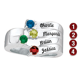 Decorate this ring with birthstones mom was born to love. This ring represents the bond between mother and her children. Choose one to four names and corresponding birthstones. Prong set gemstones measure 3.0mm in diameter. Engrave up to 8 characters per name. Choose from 10K or 14K yellow or white gold.