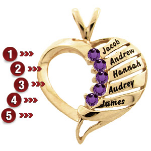 New! This pendant measures about 1 1/8" tall. The polished gold pendant features 2-6 stones and names. Engrave up to six characters or spaces per name. Chain not included. Round gemstones are 2.50mm in diameter.