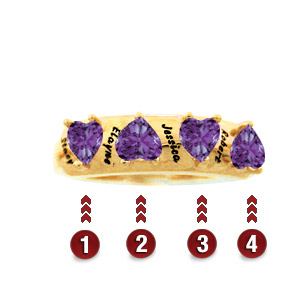 Heart-shaped gemstone is 4x4mm. Each gemstone is 3-prong set. Engrave up to seven characters or spaces next to each stone. Ring measures approximately 5.5mm at the widest top measurement. Available in 10kt or 14kt, yellow or white gold.