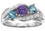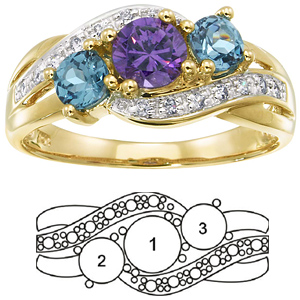 The Loved birthstone ring is set with one 5mm gemstone and two 4mm gemstones. Choose a gemstone for each of the three positions. This birthstone ring is available with simulated or genuine birthstones. The ring is set with two sweeping bands of six dazzling cubic zirconia accent stones. This ring is available in 10kt or 14kt, yellow or white gold. Approximate ring top width: 8.64mm, palm width: 1.94mm. Import.