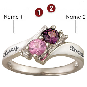 The sterling silver Amoret ring combines your choice of engraving and birthstones. This style can be worn as a promise ring or as a mother's ring. Select a birthstone color for each 4mm round birthstone. Engrave up to 10 characters in each of two engraving areas. Two 1.5mm cubic zirconia or genuine diamond accent stones. Import.