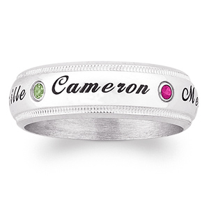 The sterling silver Boundless Love ring features your choice of one to four birthstones and corresponding names. Each Austrian crystal is 2mm in diameter. Engrave up to 8 characters in each engraving area. Ring width: 7mm. This polished sterling silver ring is 7mm wide and has milgrain edges. Made in USA.