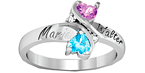 The Loving Hearts ring offers personalization for two engraving areas and corresponding heart shaped gemstones. Each gemstone is 4mm x 4mm. Choose simulated or genuine gemstones. Choose polished 14k yellow or white gold. Two .01 ct tw diamond accents. Made in USA.