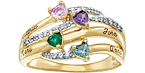 Heart shaped stones sit atop bands of gold accented cubic zirconias to capture your story. The Currents mother's ring is always set with four heart shaped gemstones: 3x3mm. 20 x 1.0mm round cubic zirconia accent stones. This ring is available with simulated or genuine birthstones. Engraving areas 1, 2, 3 and 4 accommodate up to 12 characters, including spaces and punctuation. Import.