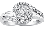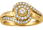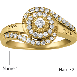 The gold Whirl ring features a 2.5mm round created sapphire and two names of your choice. 6 x 1mm round accent stones surround the center stone and 34 x 1.25mm stones decorate the shank. Engrave up to 12 characters per name. Engravings are always in capital letters. Top width: 10.75mm, palm width: 1.75mm. Import.